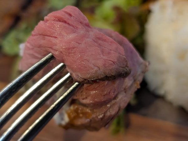 添えられたソースをかけたらいただきま~す。 しっとり焼き上げられたローストビーフは柔らか。 大きく厚切りに切られて食べ応えもばっちり!