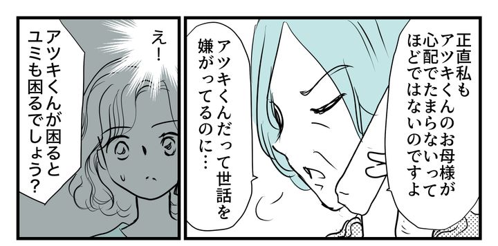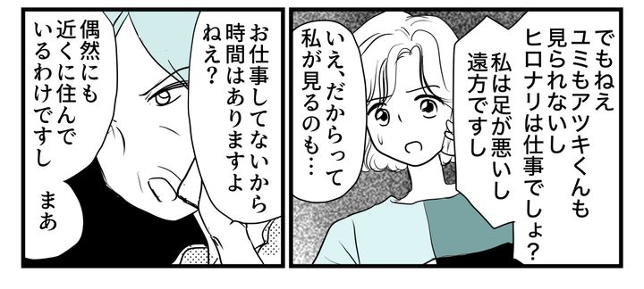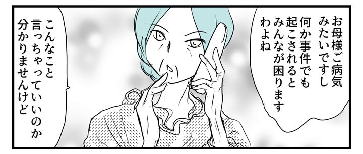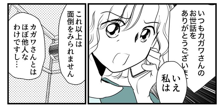 義母は「(カガワさんの)近所に住む専業主婦で時間があるから」と、カガワさんの世話を私に押し付けようとするし、私の育ちや経歴にも触れて「できる人がやるべき」と遠回しに責任を求めてきます。