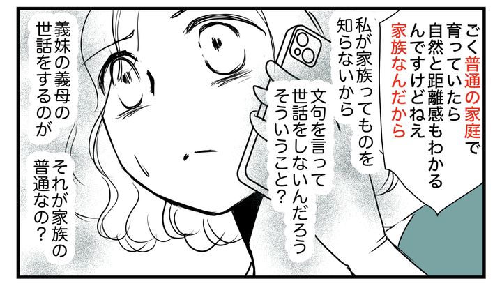 私(スズキノリコ、48歳)は幼い頃に両親を亡くし、施設で育ちました。外資系企業で仕事に励みながら不動産投資で資産を構築し45歳で早期退職。夫(ヒロナリ、50歳)と結婚した今は、郊外で穏やかに暮らしています。しかし義妹(ユミ、42歳)からの連絡で一転。義妹はうちの近所に住む旦那さん(アツキ、45歳)の母(カガワ、79歳)の様子を見てほしいと頼み、勝手に緊急連絡先として私の電話番号を各所に伝えていたのです。私がカガワさんの面倒を見られないと断るも、義妹は聞く耳を持ちません。