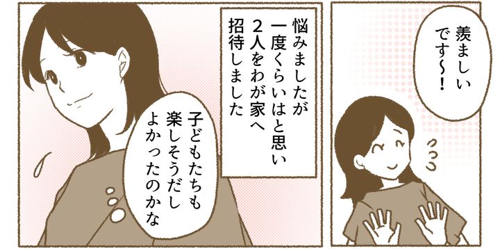 そろそろ解散する空気になってきた頃、アキコさんが「また来週くらいに集まろう」と言いました。私はとりあえず一度だけという思いで誘いに乗ったのですが、子どもたちも楽しそうだし、今後もお付き合いしてもいいかなと思いつつ、OKしました。
