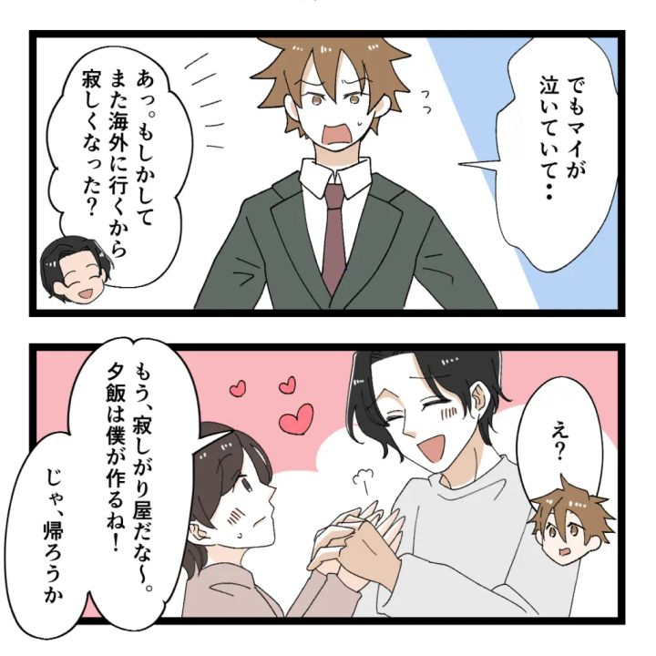マイさんへの愛情を見せつけるカイさんに対し「でもマイが泣いていて・・」とヒロトさんが言うと、「あっ。もしかして、また海外に行くから寂しくなった?」と笑いながらマイさんに話しかけるカイさん。「え?」と驚くヒロトさんなど気にも留めず、カイさんはマイさんの手を握ると「もう、寂しがり屋だな~。夕飯は僕が作るね!じゃ、帰ろうか」と二人の世界。