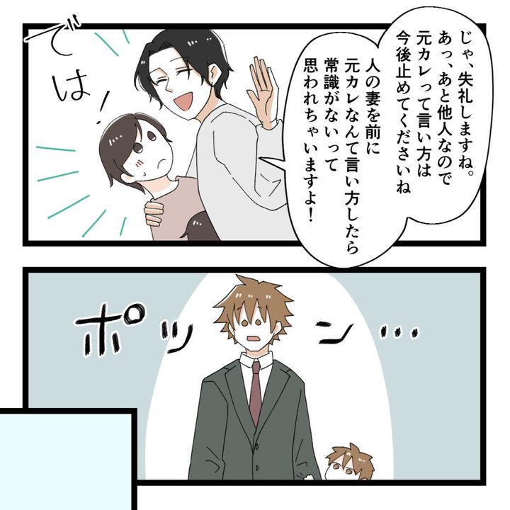 カイさんは「じゃ、失礼しますね。あっ、あと他人なので元カレって言い方は今後止めてくださいね。人の妻を前に元カレなんて言い方したら常識がないって思われちゃいますよ!では!」と言ってマイさんと子どもを連れて颯爽と帰って行きました。呆気に取られ立ち尽くすヒロトさん。ポツンとその場に残され呆然とするヒロトさんを息子のソウくんが不思議そうに見つめていました。