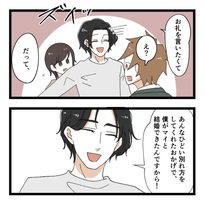 3年同棲して結婚の話しもしていたのに、浮気相手のアユミさんとの子どもができ、マイさんを捨ててアユミさんとの結婚を選んだヒロトさん。その後、マイさんは誠実でイケメンな男性カイさんと出会い結婚し、子どもも生まれ幸せな毎日を送っていました。一方のヒロトさんは夫婦仲も円満とは言えず、アユミさんが家事育児に積極的ではないため仕事、家事、育児に追われる毎日で疲弊していき「マイと結婚していたら」とマイさんのことを度々思い出していました。時が経ち、ヒロトさんは道で幸せそうなマイさん家族を見かけました。その後、息子のソウくんを迎えに行った保育園でカイさんが「僕、今日がお迎え最後で」と先生に話しているのを聞き、勝手にマイさんたちの夫婦仲が良くないと思い込んだヒロトさん。数日後に偶然マイさんを見かけて泣いていると勘違いしたヒロトさんは「俺が力になる」「別れたことを後悔していた」などと言い出し、マイさんがいくら拒否したり否定しても「強がらなくていいよ」と勘違い発言。話の通じないヒロトさんにマイさんが恐怖を感じていると、男性と一緒にいるマイさんを心配してカイさんがやってきました。すると、ヒロトさんはカイさんの前に立ちはだかり「マイの元カレです。あなたのところへは行かせられません」と言い出し、ヒロトさんの後ろで怯えるマイさんを見て何となく状況を察したカイさんは「マイからあなたの話は聞いています。僕、あなたに会いたかったんですよ」とヒロトさんに話しかけました。