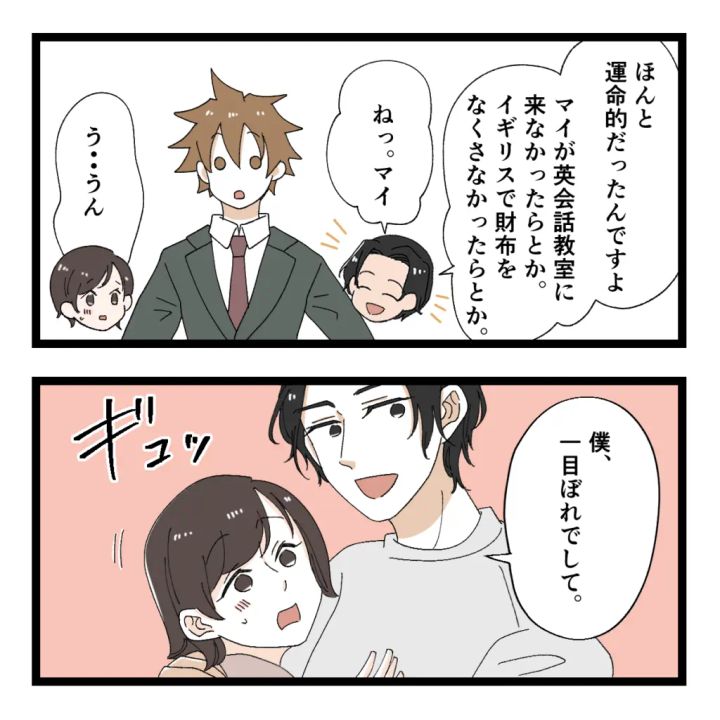 「ほんと運命的だったんですよ。マイが英会話教室に来なかったらとか。イギリスで財布をなくさなかったらとか。ねっ、マイ」と、マイさんとの出会いや馴れ初めを嬉しそうにヒロトさんに話すカイさん。そして、ポカンとしながら聞いているヒロトさんの前で「僕、一目ぼれでして」と言いながらマイさんをギュッと抱き寄せました。