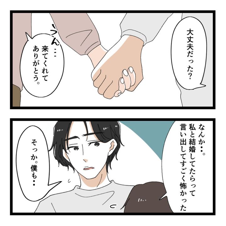 手を繋いで家に向かって歩きながら「大丈夫だった?」とマイさんを気遣うカイさん。「うん・・来てくれてありがとう。なんか・・私と結婚してたらって言い出してすごく怖かった」とマイさんが怖かった気持ちを打ち明けると、「そっか。僕も・・」とカイさんが言いました。