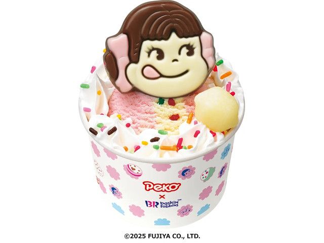 スモールサイズのアイスクリーム1コに、ホイップクリームとカラースプレー、インパクト大のペコちゃんのチョコレートをのせたとってもキュートなサンデーです。ボリューム感たっぷりのチョコレートは、ペコちゃんの頭にティアラがのったデザインの2種類あるから、どちらになるかお楽しみ♪ さらに、口の温度でとろけるように計算された、特別な生ミルキーも。北海道産の練乳と生クリームで仕立てた新食感の生ミルキーはまさにプレミアム。 サーティワンだけの特別なサンデーを見逃さないでね!