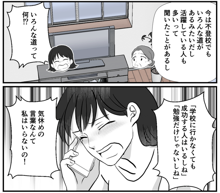 母は励ましの言葉をかけてくれますが、私は心がすさんで素直に受け取れず、つい強い口調で返してしまいました。
