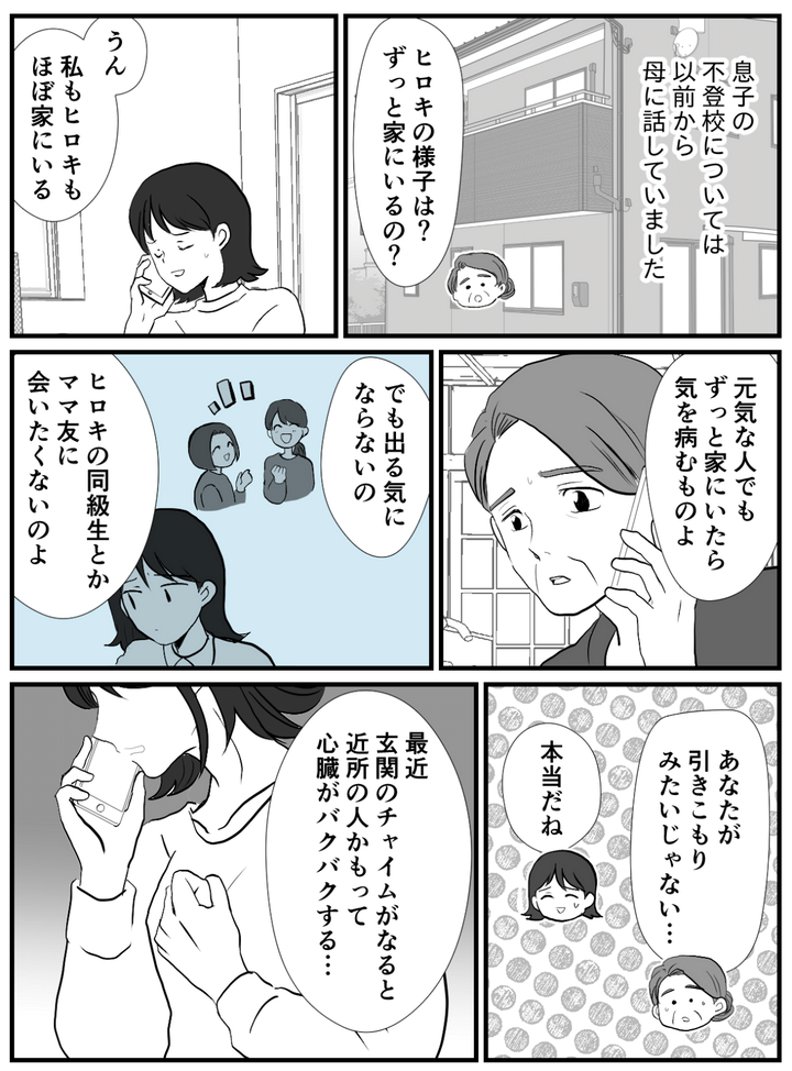 家にこもりがちになった私の様子に母は心配を募らせ外出を促しますが、私は近所の人に会うのが怖くて、外に出たくありません。