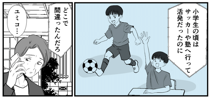 私(ユミコ、40代)は夫(セイジ、40代)と息子(ヒロキ、高校1年生)との3人暮らし。娘(ミユ、大学1年生)は大学進学を機に家を出ました。息子は元々運動神経がよく、中学1年生の途中までは学校のテストでいい成績を収めていました。しかし息子は不登校になり、高校へ進学しても自室にこもってゲーム三昧の日々を送っています。もう万策が尽き、私は神経をすり減らしていく毎日です。私は日に日に息子への愛情が減るのを感じています。