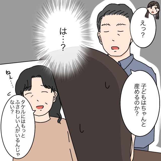 あまりにも想定外のことばすぎて「えっ?」と聞き返し動揺していると、義父も「子どもはちゃんと産めるのか?」と失礼極まりない質問。私は絶句しました。更に義母も困ったような笑顔で「タケルにはもっとふさわしい人がいるんじゃない?」と言ったのです。