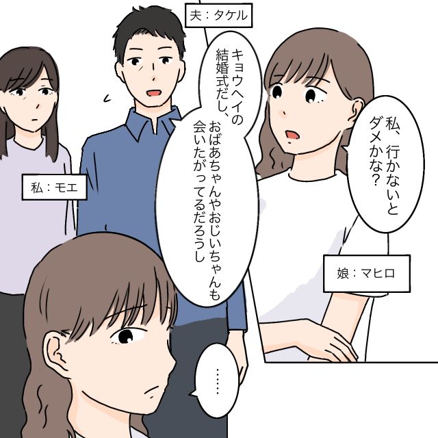 はとこキョウヘイの結婚式の招待状が届きました。親戚の結婚式なのにマヒロは「私、行かないとダメかな?」とあまり乗り気ではありません。夫は「キョウヘイの結婚式だし、おばあちゃんやおじいちゃんも会いたがってるだろうし」と言ってなんとかマヒロに行ってほしいようですが、私にはマヒロの気持ちがわかりました。