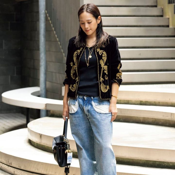 「ゴールドのコード刺繍とベルベットのコンビがオリエンタルな雰囲気のジャケットにモードなデニムを合わせて、どこかヴィンテージムードを感じるスタイリングに仕上げました」