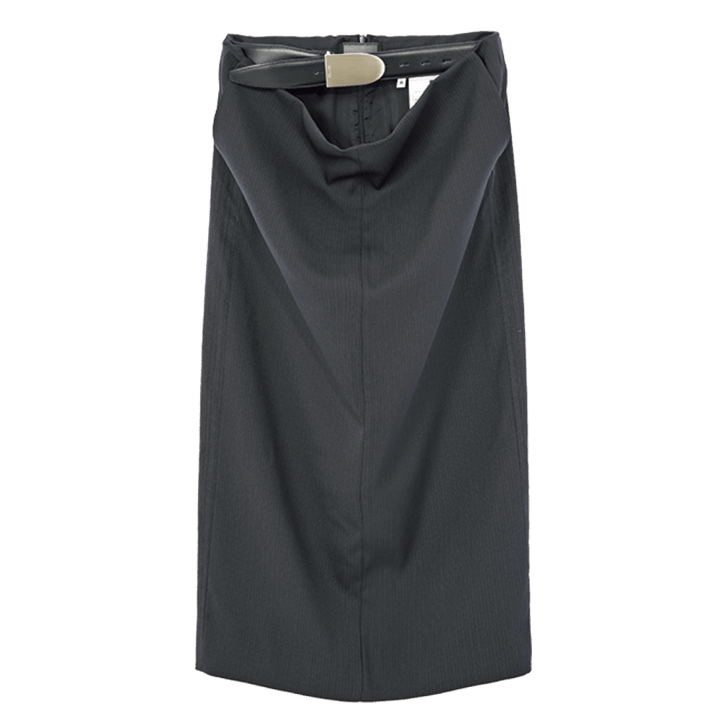 「一見シンプルなタイトスカートですが、よく見るとウエストまわりの立体的なデザインが可愛く、注目を集めそうです。ベルトを着ければよりスタイリッシュな雰囲気に」