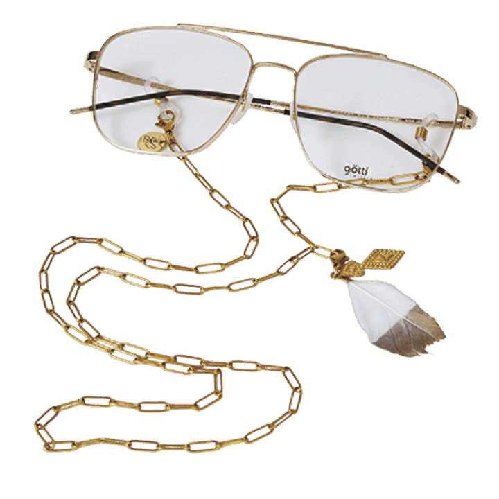 スイスのアイウェアブランド。眼鏡¥58,000(ゴッティ)、羽根がワンポイントに。眼鏡に付けたグラスコード¥11,220(サニーコーズ)