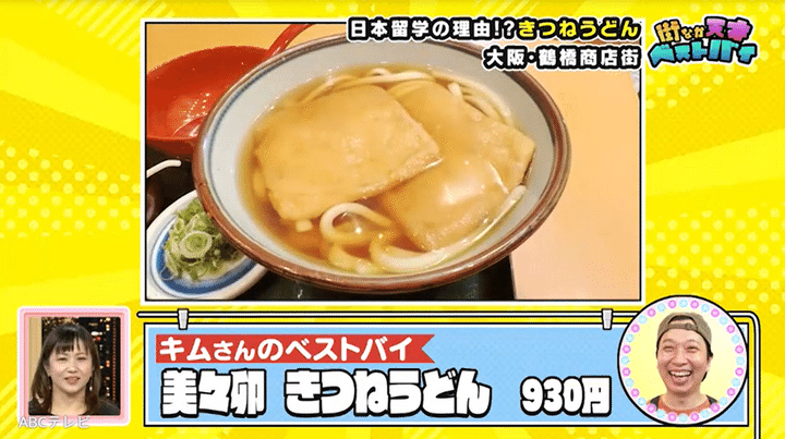 この日のロケで、天才ピアニストは食べまくり! 2人が牛ホルモン炒めにうなった店は、本場・韓国のキムチやチジミなどをリーズナブルに楽しめる土井商店。日本語がペラペラな韓国人男性スタッフは、「きつねうどんといなり寿司が大好き」という理由から来日しました。彼のお気に入り兼ベストバイは、「うどんすき」で有名な大阪の名店・美々卯のきつねうどん。油揚げから出汁がジュワ~っと出てくる瞬間が、彼の幸せなんだとか。