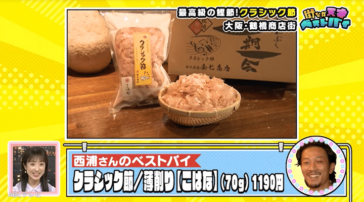 そんな白雲台の店主が「イケメン!」と称賛する鶴橋食堂の店主のベストバイは、鹿児島県枕崎市の鰹節の老舗・金七商店のクラシック節です。金七商店では、希少な本枯節(ほんがれぶし)を作るうえで最も重要なカビ付け工程中に、音楽を聞かせる独自の試みを行っています。