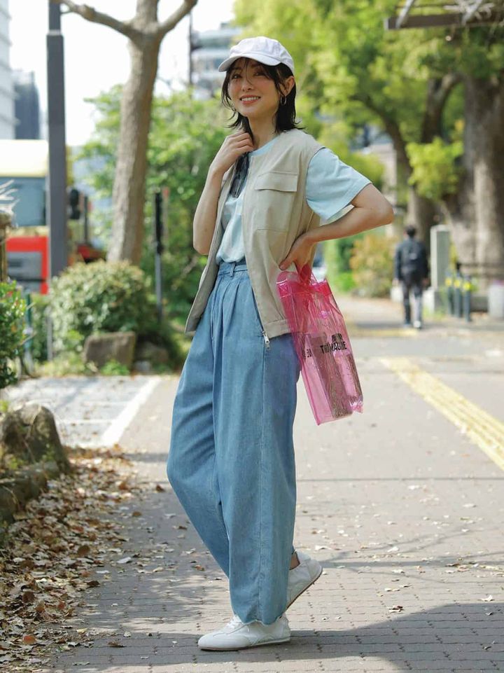 Tシャツまでブルーで統一したデニムコーデ。小物も淡色で合わせることで可愛らしく親しみやすい印象に。全体的に甘めカラーのコーデは、ブルゾンタイプのジレを羽織ってコーデに抜け感出しつつ、ピンクのバッグで遊び心をプラス。