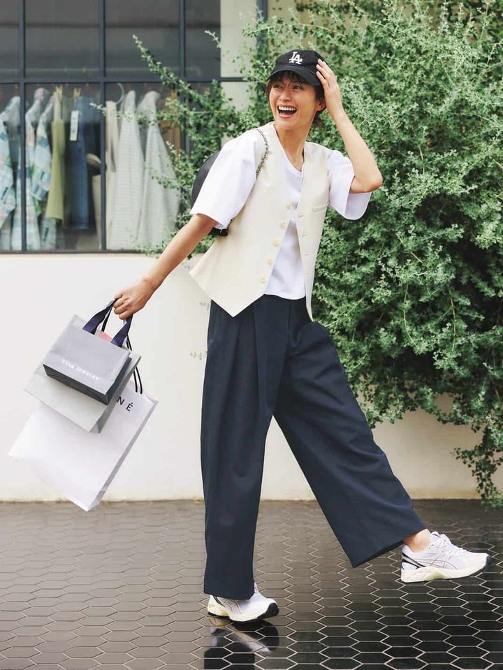 洒落感たっぷりなワイドパンツコーデ。ゆるっとしたTシャツやワイドパンツの組み合わせは、アクティブな日も安心!ジレを合わせることでトレンドっぽさを出しつつ、上品な印象に。ラフっぽさ高めなキャップやスニーカーを取り入れて抜け感を狙いたい。