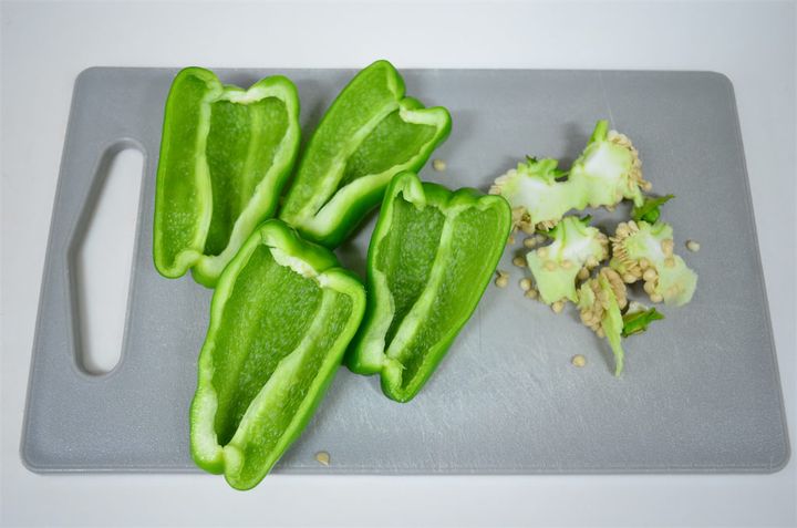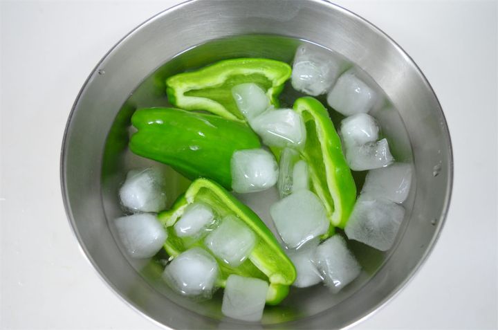 2ピーマンを半分に切り、ヘタとワタを取り除く。 ボウルにたっぷりの氷水を作り、ピーマンを浸したまま冷蔵庫で1時間以上置く。