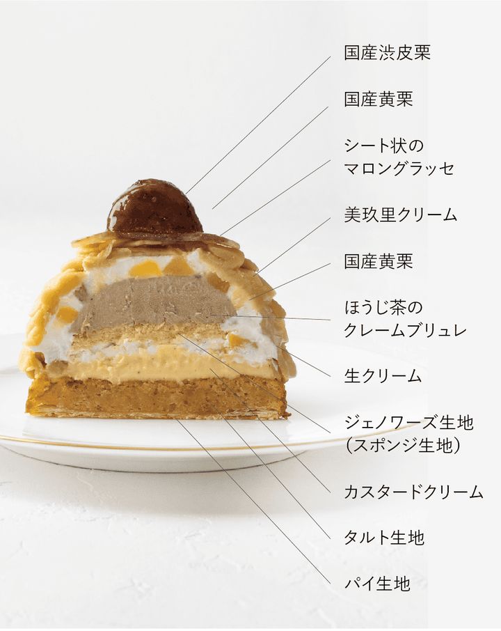 第一弾は、芳醇なモンブラン「Premier マロン Robe de Reine -女王のドレスー」を展開。国産和栗と和素材のほうじ茶を合わせたテイストで、普通のモンブランとは一線を画す美味しさ。クリームやタルト、パイ生地には厳選した平飼い卵を用い、豊かな風味と深いコクで濃厚な栗の味わいを引き立てています。毎朝丁寧に手絞りするマロンペーストは、ホクホクとした甘味と強い香りから“栗の女王”と呼ばれる熊本県産の希少な栗「美玖里(みくり)」を使用。その名にちなんだ姿にするため、ドレスを思わせる気品あるデザインに仕上げています。