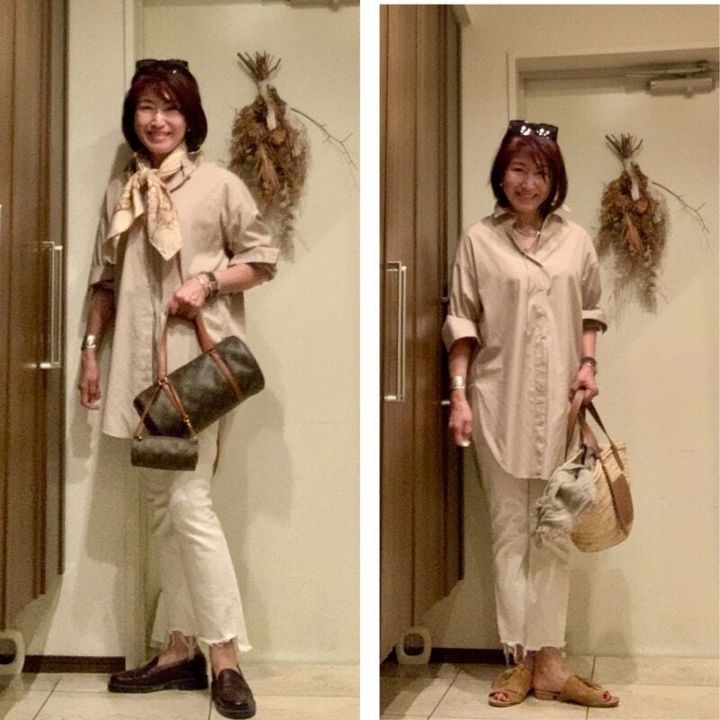 3. 【60代秋ファッション】ベージュのシャツ&デニムを使って、残暑~秋へのスイッチコーデをご紹介!