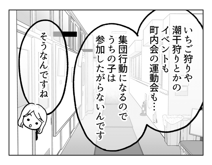 今回のお話の主人公はエミさん。夫コウジさんの転勤で、小学1年生の娘ユカリちゃんと都内から約1時間離れた新しい地へ引っ越してきました。登校班に参加するには地域の「子ども会」への加入が必須だと知り、月額1,200円の会費を支払うことに決めたエミさん。しかし、後日ゴミ拾いや役員の順番がまわってくることを知り、少し後悔することに……。そんななか、学校の授業参観で子ども会に加入していないナオさんと出会い、加入しない選択肢もあることを知り驚きます。