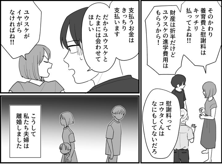 そうして私は旦那と離婚しました。旦那はユウスケを引き取りたがっていたけれど、あんな人に育てられたらたまったものではありません。私は収入もあるし、実家に頼らなくてもひとりで生活できる!! そう思っていたのですが……現実はそううまくはいかないもので。