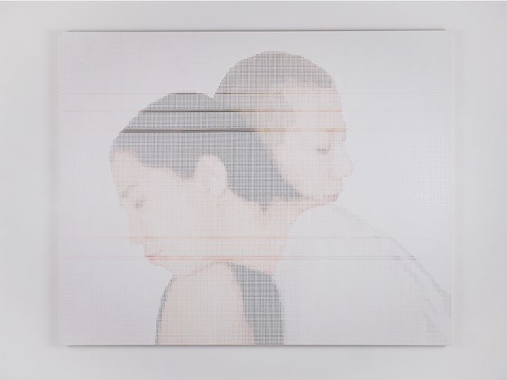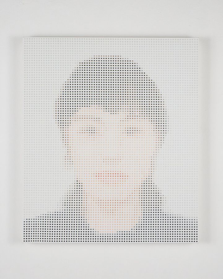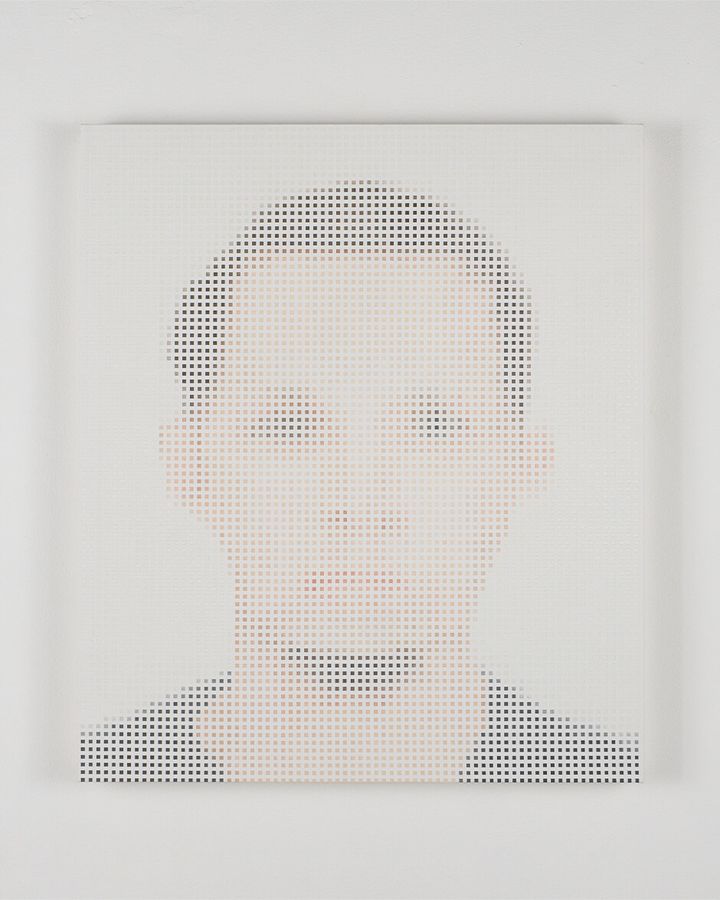 キャンバスに個人の証明写真がピクセル状の色面で描かれる「tie」シリーズは、「わたし」という「個」や「アイデンティティー」という社会的空間における個人の形成を問いかける作品群。