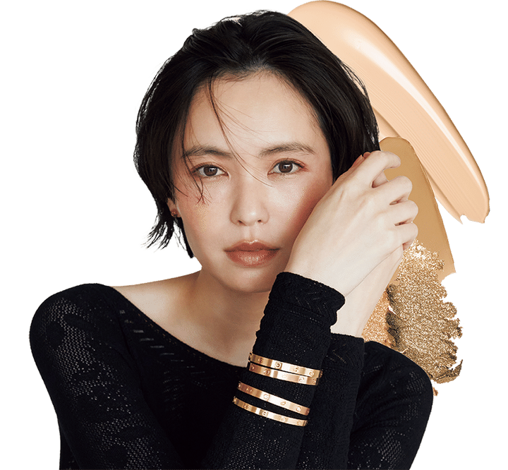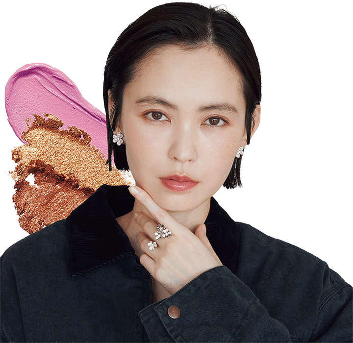 ヴァン クリーフ&アーペルの「フリヴォル」ジュエリーと共鳴させるような、発光肌メイクで涼やかで上品なムードが完成。湿度が高めの日や、洗練されたモノトーンスタイルに合わせて。