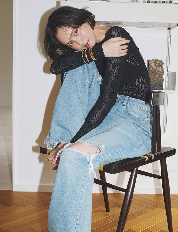 「LOVE」ブレスレット、手先から:[YG]¥1,174,800、[PG]¥1,174,800、[PG×DIA※ブラッシュ仕上げ]¥1,887,600、[YG]¥968,000、「LOVE」イヤリング[YG]¥260,700(全てカルティエ/カルティエ カスタマー サービスセンター)、ボディスーツ¥42,900(フェティコ/ザ・ウォール ショールーム)、中に着けたブラ¥6,600(ナイスナイスモーメント/ショールームリンクス)、デニム¥55,000(セファー/サカス ピーアール)