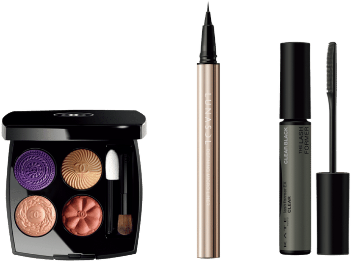 右から:1_自然な美まつ毛に。ケイト ラッシュフォーマーEX(クリア)BK-1 ¥1,078※編集部調べ(カネボウ化粧品) 2_まつ毛キワにも描きやすい極細で柔らかな発色の黒。ルナソル ディファイニングマイクロライナー 01 ¥3,850(カネボウ化粧品・8月8日発売) 3_メゾンを象徴するボタンデザイン。レ キャトル オンブル ブトン 239 ¥11,880(シャネル・8月22日限定品)