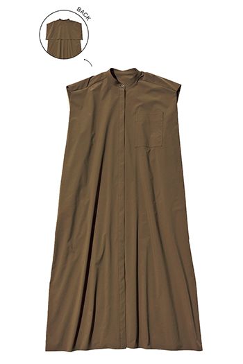 ブラウンノースリーブワンピース/LE PHIL(LE PHIL NEWoMan新宿店) 快適性と女性らしさをモットーに、幅広い世代から愛されるLE PHIL。ソフトな風合いや伸縮性、適度なクッション性をそなえ、定番として展開している「ソロテックス」素材を使用した新作は、ゆったりとしたフォルムにセーラーカラーのような後ろ姿が特徴的。