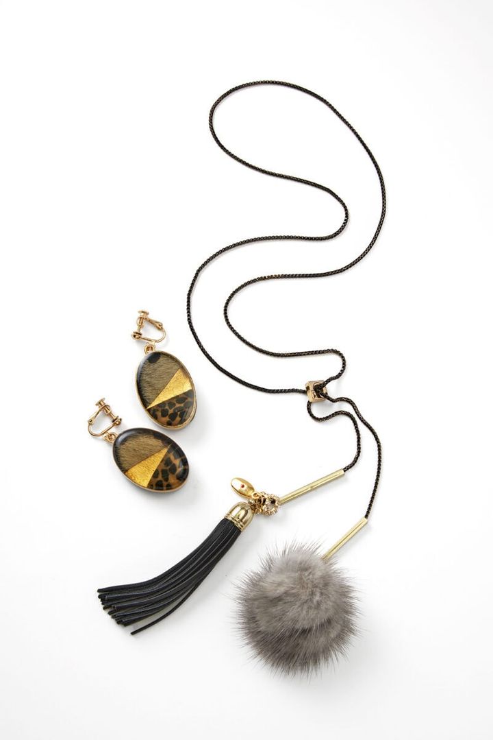 よりさりげなく季節感を演出するなら、アクセサリーだけ秋を感じるものに変えても。「少し大ぶりなネックレスやイヤリング&ピアスは、つけるだけで着こなしの印象を変えてくれるので、そこで秋らしさを足すのもいいですよね。ファーやハラコを使ったものや、アニマル柄などを探してみてください」。まずは小物から、「秋っぽコーデ」に衣替えを。