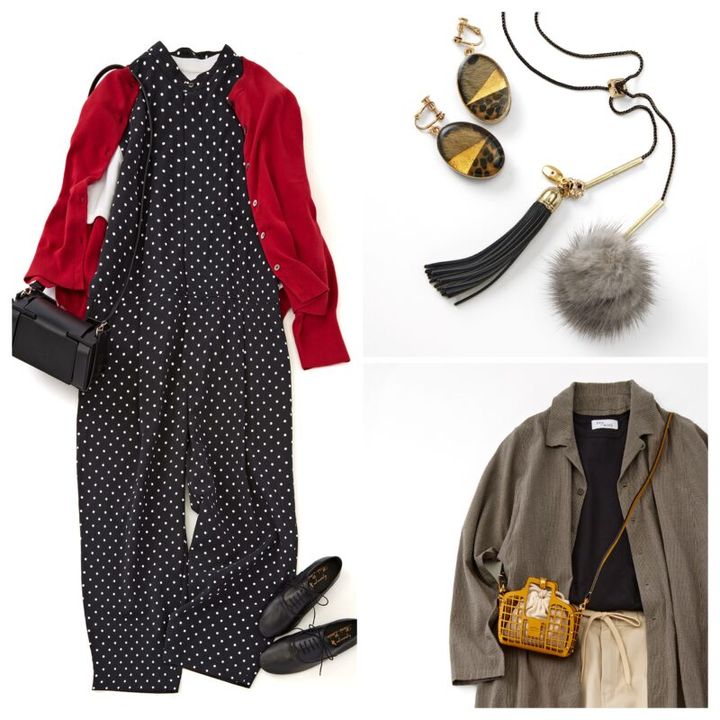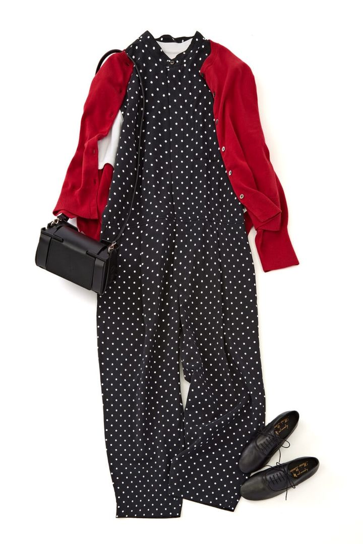 薄手の素材で軽快に着られるオールインワンは、残暑にも重宝するアイテム。秋らしさを出すなら、「カーディガンを足すのがおすすめです」と為井さん。秋口はまだ気温も高く、雨の日も多く湿度も高いので、素材はコットンをチョイス。今季トレンドの赤を取り入れれば、気分も高まります。バッグやシューズも黒のレザーで印象を引き締めて。