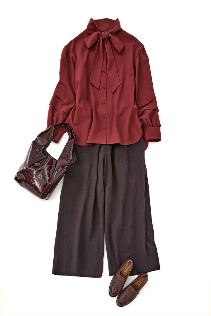 トップスとボトムだけのシンプルなスタイルで秋らしさを引き出すなら、「デザインと素材感、そして色選びがポイントです」と為井さん。ボウタイ付きのブラウスでクラス感をアップ。色は深みのあるボルドーをチョイス。ボトムには、こっくりしたココア色のシルクリネンパンツを合わせて。「パテントバッグでツヤ感を足すのもポイントです」。