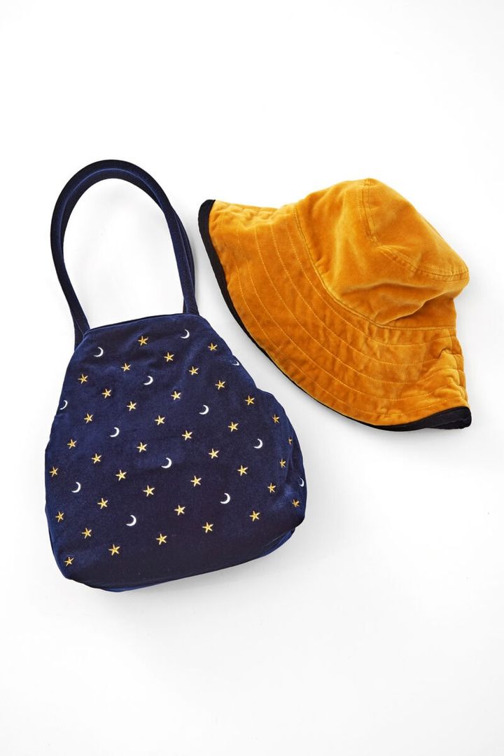 「暑い日が続くこの時期は、洋服にはまだ軽やかさがほしいですよね。なので、小物だけ変えて秋らしさを足しても。ベロア素材のものは一つあると便利です」。バケットハットもベロア素材にチェンジ。バッグもベロアを選んで、素材感をリンクさせても。ベロアが持つ上品な光沢が加わるだけで、コーディネートがぐっと秋めいた雰囲気に。