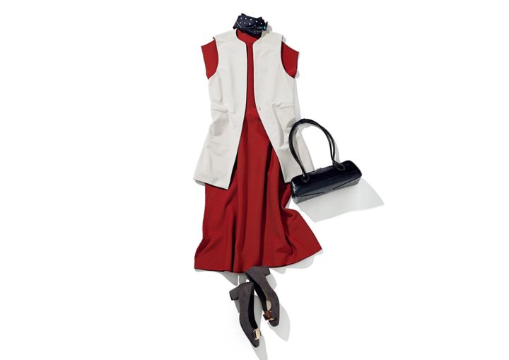 ジレ¥19,000、ニットワンピース¥15,000/ともにPLST スクエアパンプス¥9,900/RANDA 横長バッグ¥17,380/Cepika(ジオン商事) スカーフ¥16,500/マニプリ