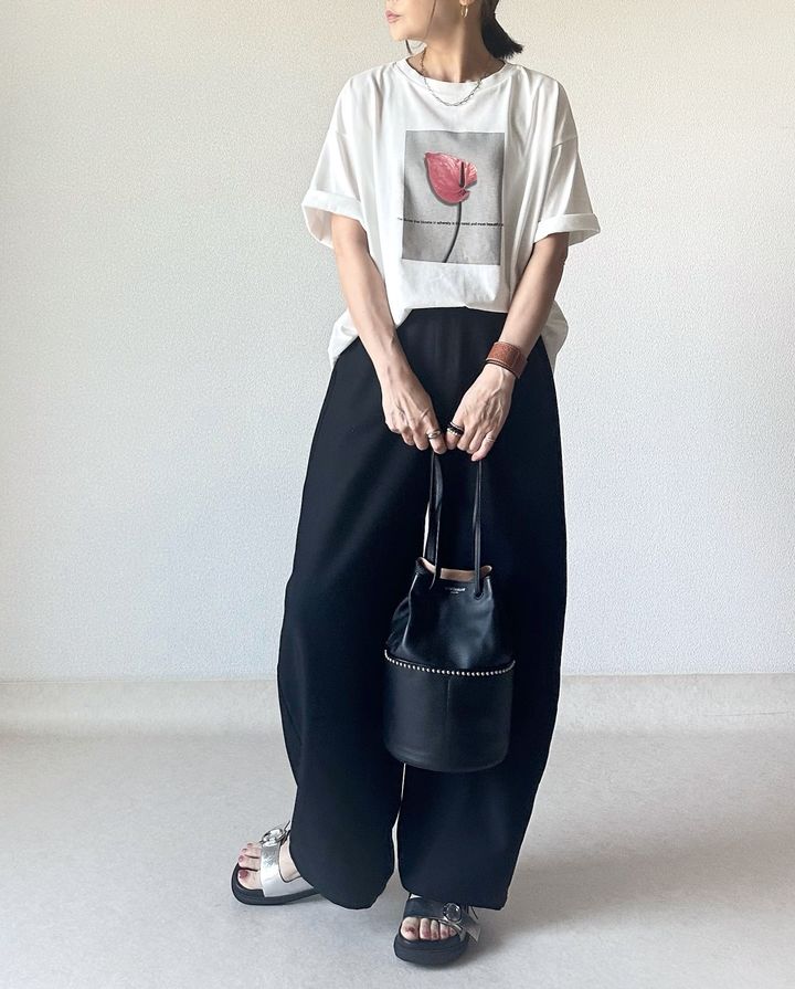 ゆったりとしたシルエットのフォトTシャツは、ほどよい抜け感を演出してくれるアイテム。落ち感のあるワイドパンツと合わせることで、リラックスしながらもきちんと感をキープ。足元はシルバーのサンダルでモード感をひとさじプラス。