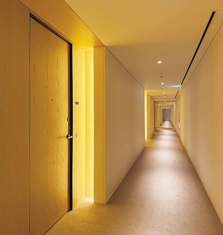 潔いほどシンプルな廊下は、絶妙に柔らかな照明がデザインのアクセントに