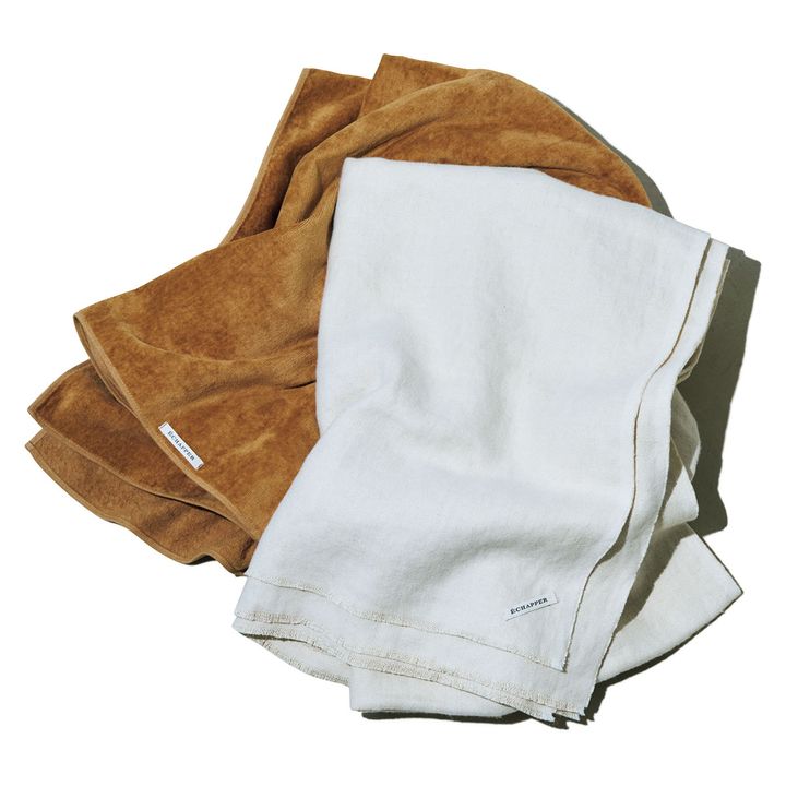 厳格な基準をクリアした天然素材を使い自然と人に優しいものづくりで知られるエシャペの寝具たち。ベッドに添えてあるだけで上品な佇まいの寝室に。[上から]ハーフブランケット〈H100×W150cm〉¥29,150ブランケット XL〈H148×W100cm〉¥39,600(ともにエシャペ/エイトン青山)