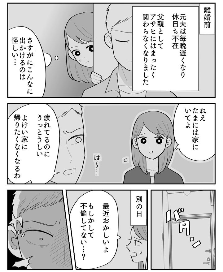 私はミキ。フルタイムで働きながら息子のアサヒ(小3)を育てています。元夫とは3年前に離婚しました。原因は元夫の不倫です。しかも問い詰めると逆上して暴言を吐き、追い打ちをかけるように元義母まで私が悪いと責めてきました。耐えられなくなった私はアサヒを連れて家を出て、弁護士に依頼して離婚成立。今の住まいは元夫にも元義母にも教えていません。慰謝料や月々の養育費を払ってもらう条件で、現在は2ヶ月に1回の面会を受け入れています。