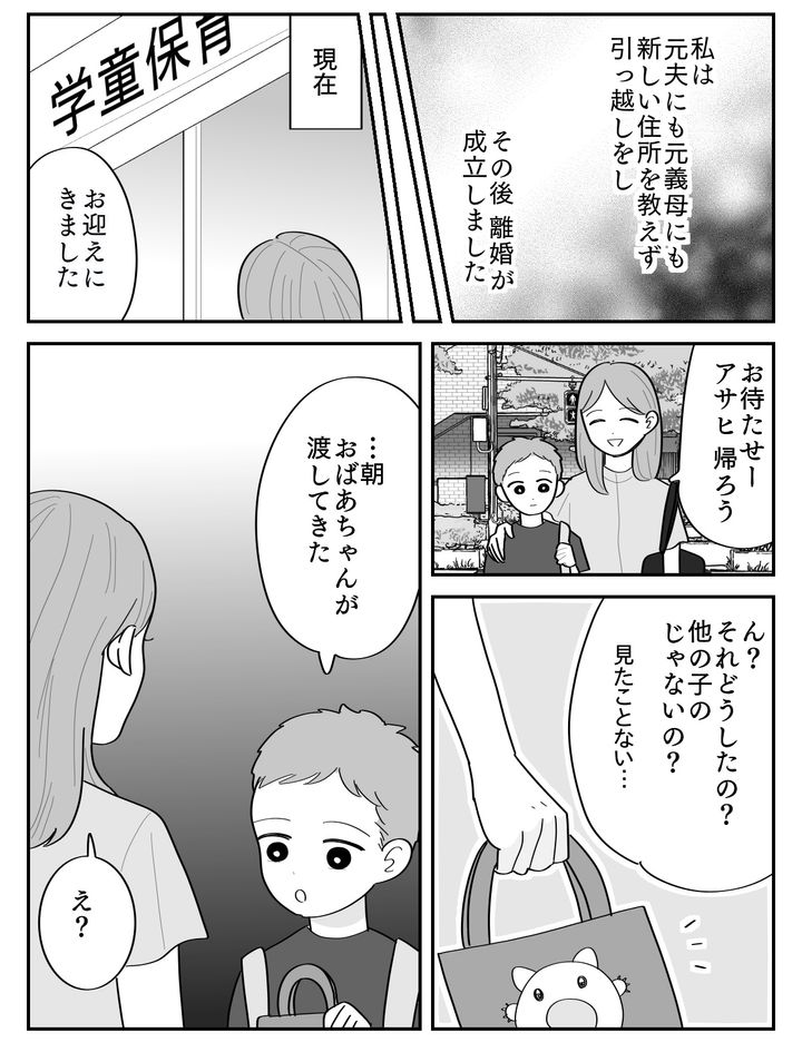 なのに元義母が今朝、学校のそばにいたというのです。手渡されたというのは、面会のときにアサヒが話していた好きなキャラクターのグッズ……。どうして学校がわかったの!? 私はとっさに状況を理解することができなかったのでした。