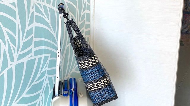 筆者は国内旅のサブバッグとして、物の出し入れが楽で自立するカゴ型バッグを愛用中。スーツケーススリーブ付きの旅行バッグの存在も知ってはいますが、どうしてもお気に入りのカゴバッグをスーツケースに掛けたいと思い、見つけたのがセリアの「トラベル用フック付きベルト」です。