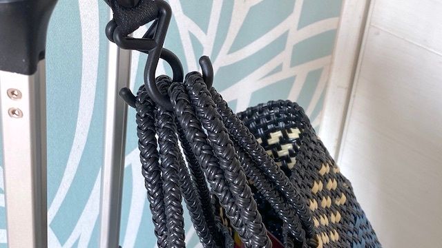 このベルトにはフックが2つ付いているので、カゴバッグや手提げをしっかりと固定できます。持ち手を掛けやすく、移動中に外れにくいのが魅力。実際に使ってみても、歩いていてバッグがずれることがほとんどなく、スマートに移動できる快適さを実感しました。