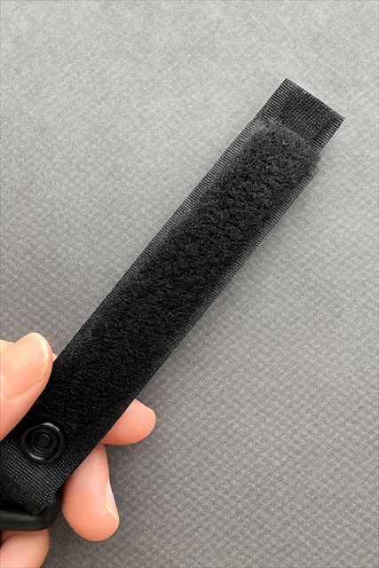 価格は110円(税込)で、フック付きベルトが2個入り。ベルト部分はマジックテープになっていて、スーツケースのハンドルに取り付けて使います。商品説明によると、マジックテープが重なる範囲は5cm以上にしてください、とのことです。