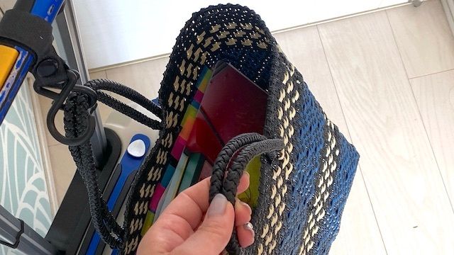 カゴバッグの持ち手を外して、中のものをパッと取り出せるので便利