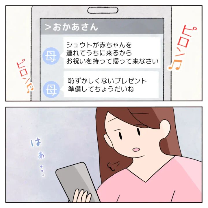 そのタイミングで母からメッセージ。『シュウトが赤ちゃんを連れてうちに来るからお祝いを持って帰って来なさい。』『恥ずかしくないプレゼントを準備してちょうだいね。』・・・相変わらずな母を想像して、思わずため息が出てしまいました。