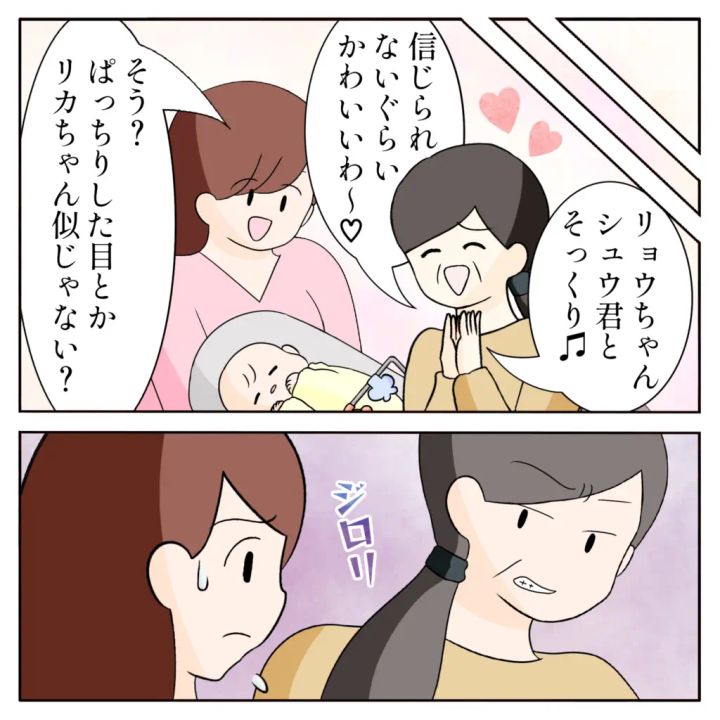 実家では産まれたばかりのシュウトの息子くんに会えて幸せな気持ちになりました。母もとても嬉しそう。「リョウちゃん。シュウ君とそっくり。信じられないくらい可愛いわ~」と言ってニコニコです。私は何の気なしに「そう?ぱっちりした目とかリカちゃん似じゃない?」と言ってしまってハッとました。母が鬼の形相で睨みつけてきたのが分かったからです。