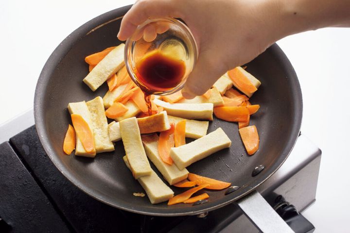 (2)フライパンにサラダ油大さじ1を中火で熱し、高野豆腐、にんじんを入れて強めの中火で炒める。にんじんがしんなりしてきたら〈A〉を回し入れ、にらを加えてさっと炒め合わせる。