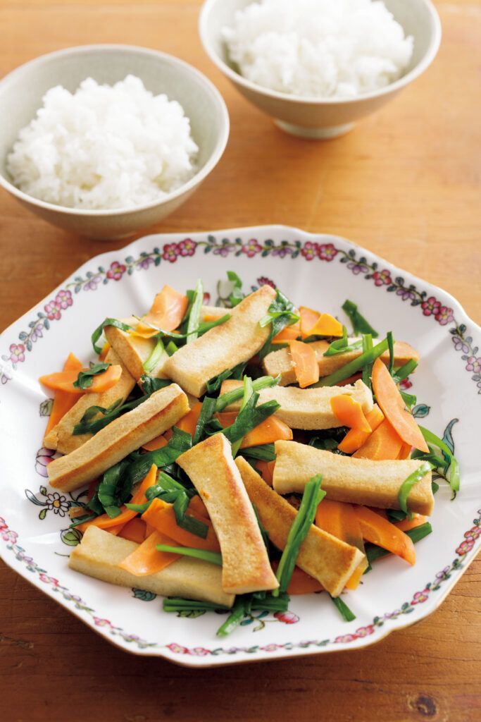 高野豆腐は鶏ガラスープの素を混ぜたぬるま湯につけることで早くもどり、下味もつきます。また、調味料はあらかじめ混ぜておくのがポイント。フライパンに回し入れたらすぐににらを加え、焦げつかないように手早く炒め合わせます。